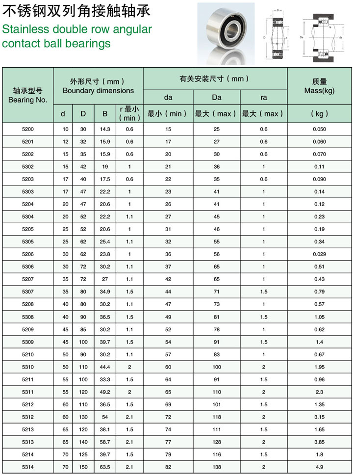 不锈钢双列角接触球91看片免费版型号尺寸规格参数